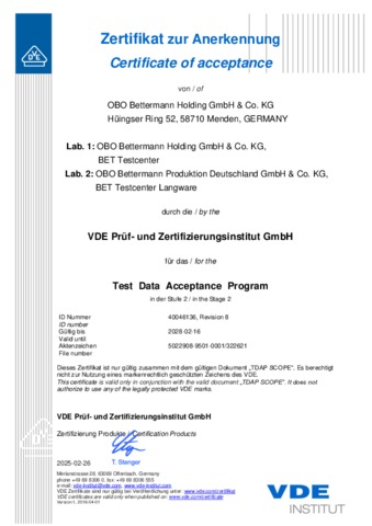 OBO-produkter står for den højeste kvalitet. For at garantere dette anvender vi vores eget BET-testcener sammen med omfattende eksterne tests. Her sættes OBO-produkternes kvalitet, belastbarhed og bæredygtighed på prøve i omfattende tests. Vores højt kvalificerede specialister kontrollerer blandt andet lynbeskyttelseskomponenter, lynbeskyttelsesstrukturer og overspændingsbeskyttelsesanordninger. Effekterne af lynhændelser undersøges også ud fra et videnskabeligt perspektiv.