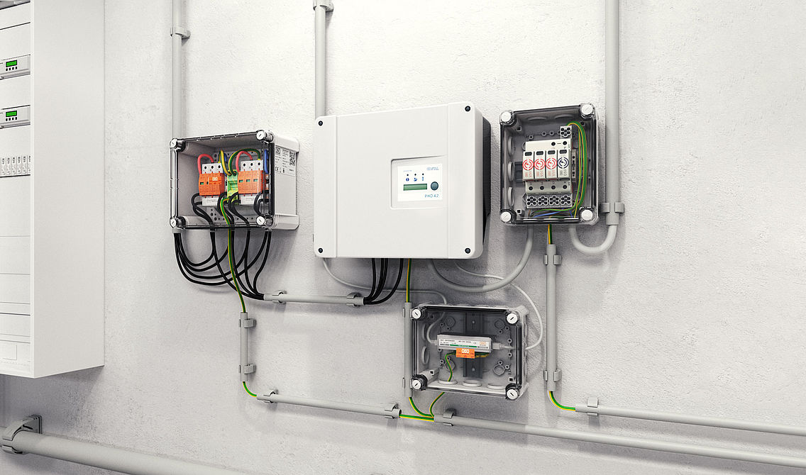 Overspændingsbeskyttelse til solcelleanlæg har altid to sider: Både på jævnstrøms- såvel som på vekselstrømssiden kan overspændinger finde vej til systemet af forskellige grunde og dermed eksempelvis skade vekselretteren. OBOs overspændingsbeskyttelse sikrer pålideligt alle sider. For at beskytte vekselretterens indgang på DC-siden tilbyder OBO et udvalg af generatortilslutningskasser med lyn- og overspændingsbeskyttelse. De har vist sig at være en særligt pålidelig løsning til beskyttelse af solcelleanlæg og forener OBOs ekspertise fra to forskellige produktenheder med hinanden: Vejrbestandige tilslutningskasser fra forbindelses- og fastgørelsesteknikken kombineres med pålidelige løsninger inden for overspændingsbeskyttelse.