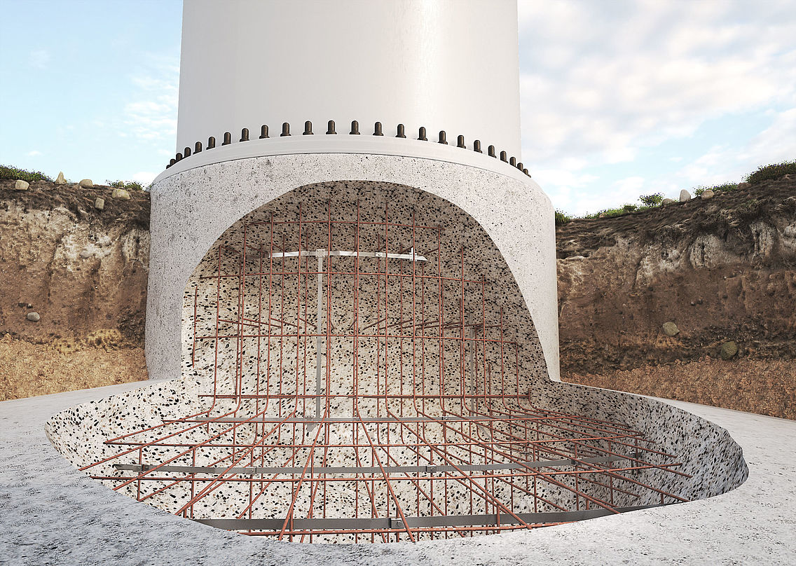 Fundamentet til et vindenergianlæg løser som overgangspunkt mellem tårn og jord flere opgaver på samme tid: For det første sikrer det vindenergianlægget mod at vælte eller synke, for det andet leder det alle de belastninger videre til jorden, som rotoren og anlæggets egne bevægelser giver anledning til. De fleste fundamenter til vindenergianlæg på land, det vil sige onshore, er såkaldte direkte funderinger. De består mest af runde plader af beton og stål, som anbringes i jorden og samtidigt leder kræfter ned i undergrunden. Piloteringer eller pælefunderinger tages i brug til underlag, der ikke har stor bæreevne. For at give tilstrækkelig styrke bliver fundamentpladen her forsynet med pæle. På den måde bliver belastningerne så ledt videre til jordlag med større bæreevne. Fundamentets form bestemmes på den ene side af vindenergianlæggets størrelse, på den anden side af jordens egenskaber. Det kan for eksempel være ottekantet, cirkelformet eller krydsformet.