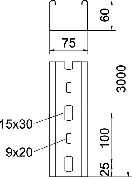 Belastningstype iht. IEC 61537 Type II Bredde 75 mm CO2 fodaftryk (GWP) fra vugge til port 3,2397 kg CO2e / 1 meter Dimension 60x75x3000 Effektivt tværsnit 42 cm² Farve zinc Forbindelsestype kabelbæresystem skruet Højde 60 mm Længde 3000 mm Materiale Stål Model forbindelser uden beslag Monteringshul i bunden Ja Overflade Varmgalvaniseret Pladetykkelse 0,75 mm Rustfrit stål, bejdset Nej Sidehuller Ja Støtteafstand 1,5m 0,8 kN/m Støtteafstand 2,0m 0,55 kN/m Støtteafstand 2,5m 0,35 kN/m Støtteafstand 3,0m 0,25 kN/m Tekniske data