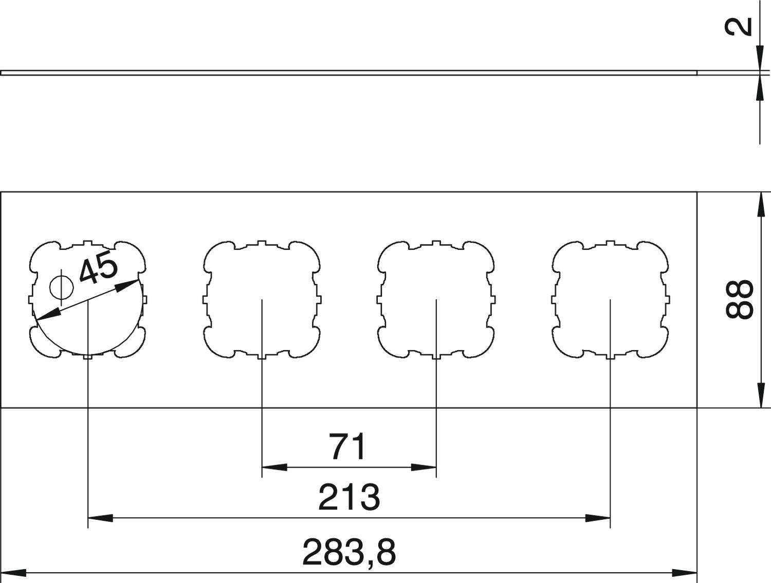 Produkt beskrivelseDækplade med 4 huller (Ø 45 mm) til 4 installationsenheder med bærering eller -bøjle, passer til T12L-langside (1/1-afdækning).