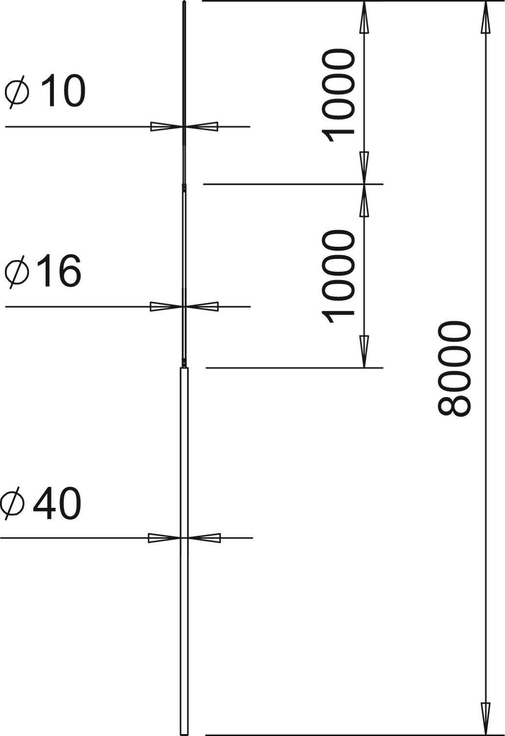 Diameter 40 mm Dimension 8000mm Højspændingsfast isoleret model Nej Længde 8000 mm Mål B 6000 mm Mål D 1000 mm Mål H 1000 mm Materiale Aluminium Nominel størrelse Ø 40/ 16/ 10 mm Udførelse Opfanger med stativ - Alle typer