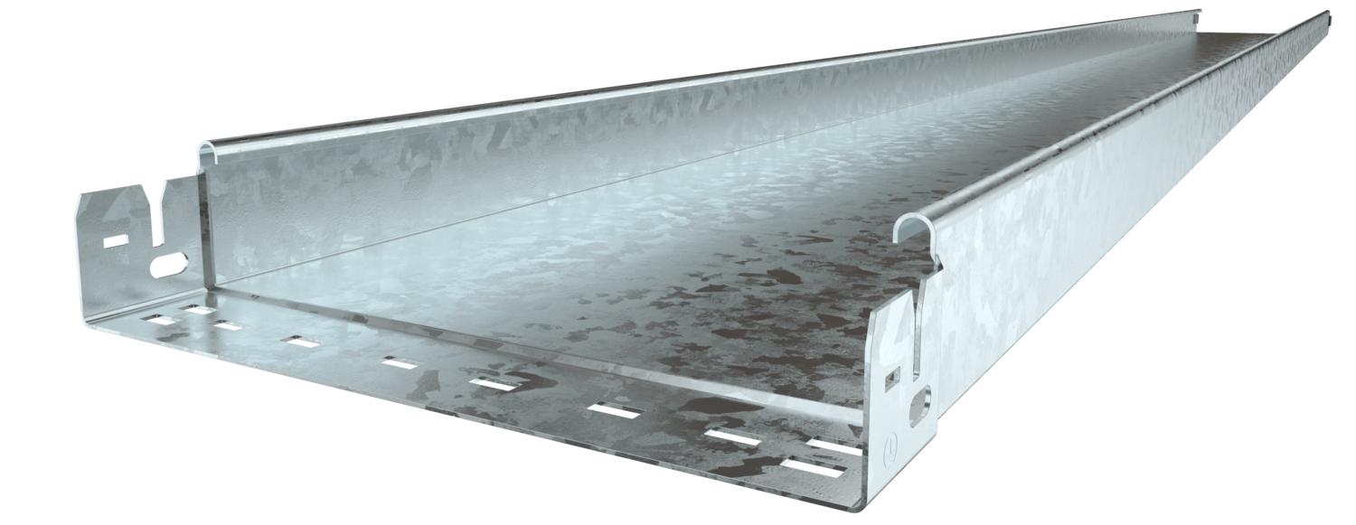 Uperforeret kabelbakke med integreret snapfastgørelsessystem. Kabelbakkens effektive længde er 3.000 mm.