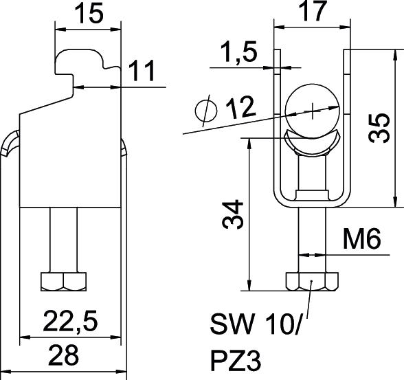 Produkt beskrivelseKabelbøjle med N-fod, metalholdestykke med afrundede kanter til kabelbeskyttelse. Til lodret og vandret montering af 1 enkeltkabel på C-profilskinne. Til kærvbredde 11 - 12 mm. Med 1-gænget skrue på holdestykket, universel sekskant-skruehoved SW10, med kærv og krydskærv. Egnet til inden- og udendørs brug. Det anbefales at anvende et modholdestykke.