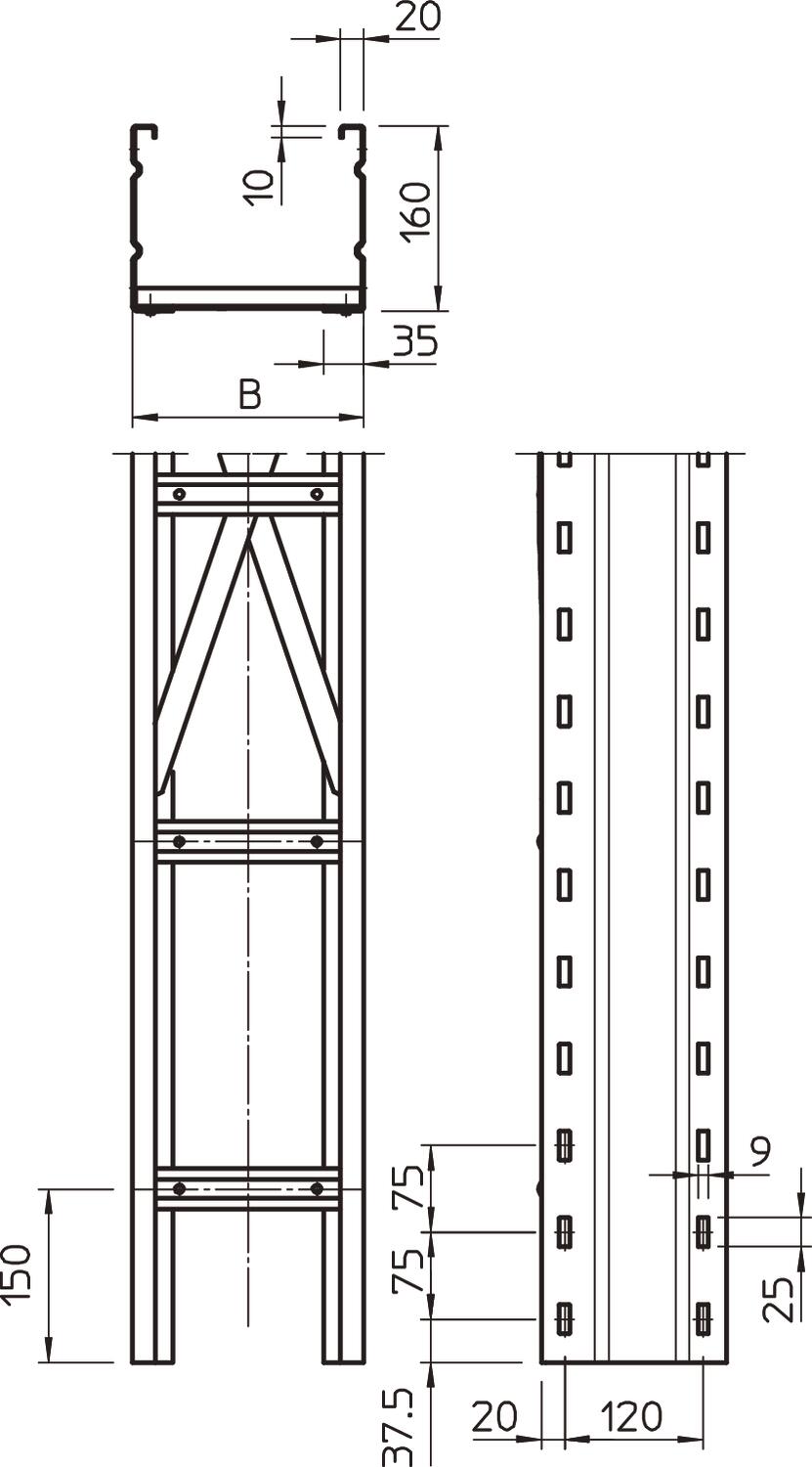 Produkt beskrivelseKabelstige med stor spændvidde med perforeret sidevange i 160 mm sidehøjde. Fastgørelse af kabler og ledninger med kabelbøjle type 2056.
