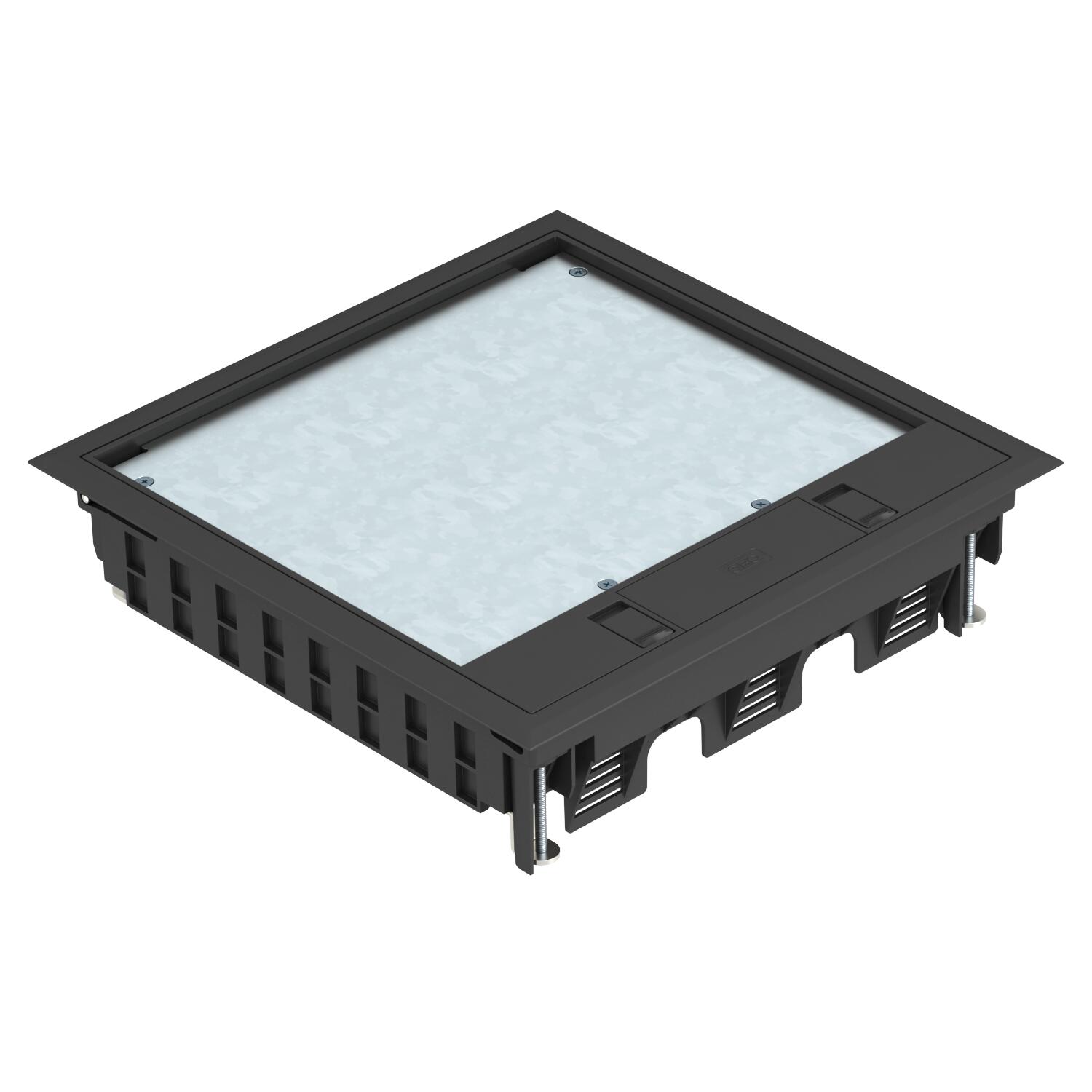 Gulvboks med låseskyder, 3-sporet, til montering af monteringsholder MT4. 3 dækplader af typen APMT5 kan installeres.